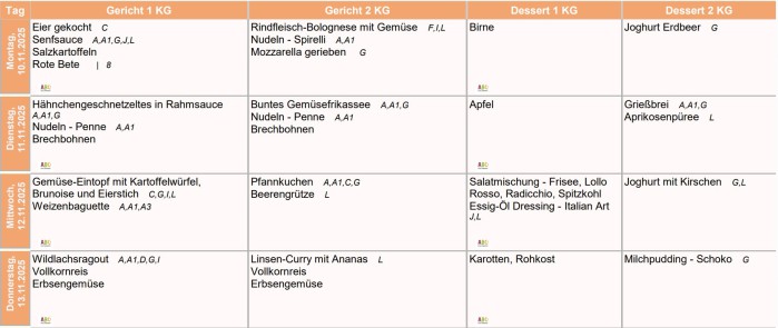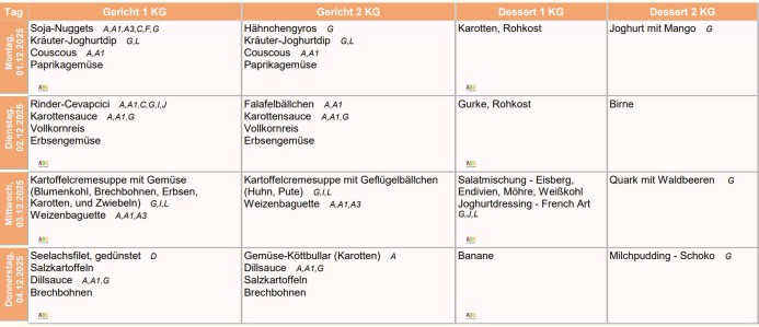Der Speiseplan vom 01. Dezember bis 04. Dezember 2025